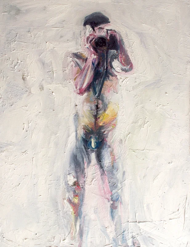 The best I can do is try to give you some insight into my thoughts as I paint. The image below is a difficult one for me, purely from a bashful point of view. The subject is yours truly with a camera. Originally my ideas for this work revolved around :