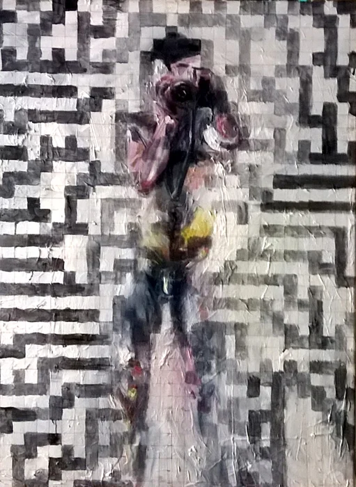 The use of cellular automata is the latest addition to the painting. The rule used is Rule 30. Unlike some cellular automata rules, Rule 30 will not 'die' . It is a random and infinite rule set. I'm still digesting the effect of the generative cellular automata on the work. But my thoughts have turned to the dispersal of personality in the digital age. There is a sense of dissolution and corroding of information in the work. As for the camera, it was always meant to represent a voyeur. I no longer think of the figure in the image as myself , I think it has become to laden with symbolism.