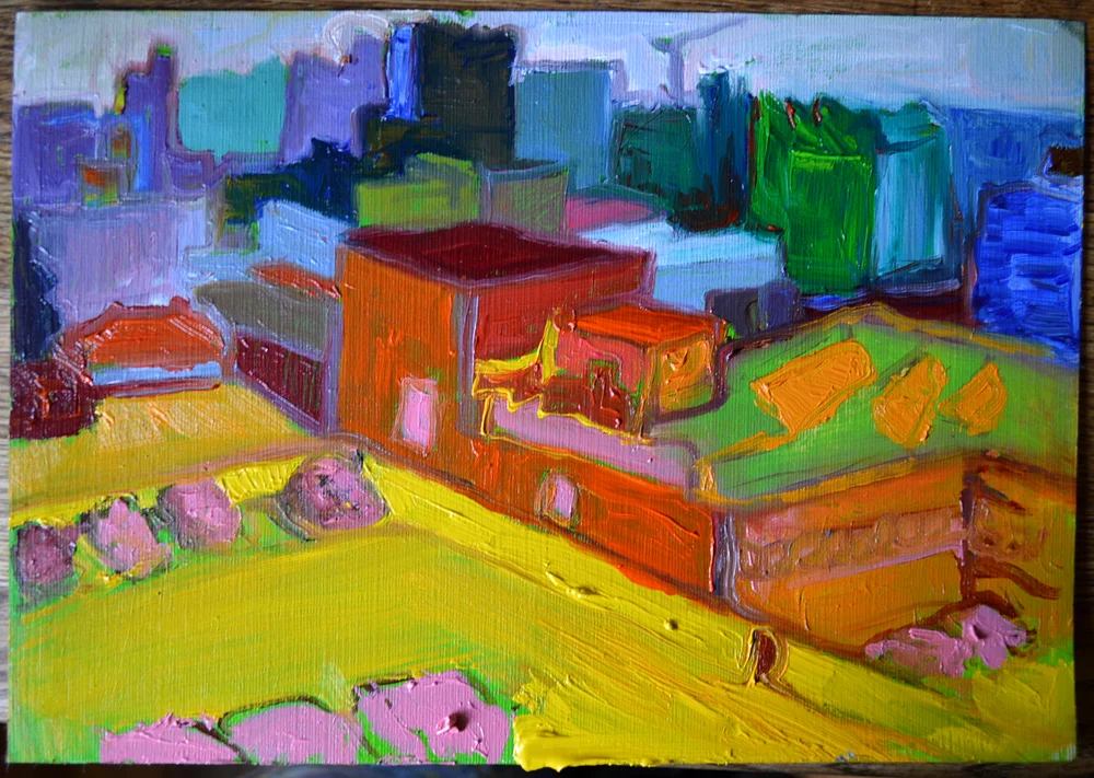 Dodging the swarm, Oil on Oil painting paper, 10" x 7" - Sheffield city study for a larger piece.