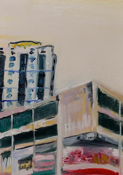 Dodging the swarm, Oil on Oil painting paper, 10" x 7" - Sheffield city study for a larger piece.